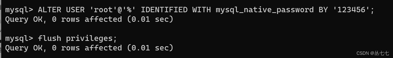 ALTER USER ‘root’@’%’ IDENTIFIED WITH mysql_native_password BY ‘123456’;