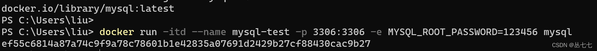docker run -itd --name mysql-test -p 3306:3306 -e MYSQL_ROOT_PASSWORD=123456 mysql